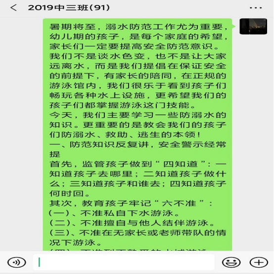 幼儿暑假在家,家庭的教育、监管,此时显得尤为重要,所以在做好幼儿安全教育的同时,新生幼儿园特别注重家园联手,共同筑起了一道安全的防线。各班通过召开线上防溺水专题会谈等多种形式倡议家长朋友们要加强防溺水意识,教育孩子不要单独前往池塘、河边、井边行走玩耍。
