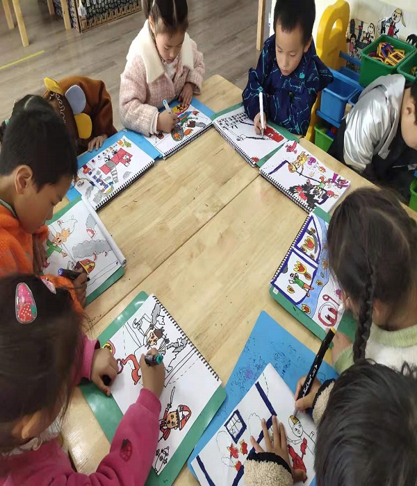 孩子们自发的为消防叔叔进行绘画创作。绘画的过程中,孩子们一直感叹:“哇,消防员叔叔也太厉害了吧!”