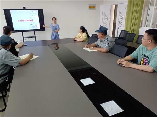 上午,首先,园长丁海燕从保安礼仪、责任担当、服务意识、三防技能的等方面对保安提出了进一步的要求。其次,副园长张艳红针对当前对疫情防控的要求,培训保安如何进行疫情防控、传达室消毒,以及垃圾分类的一些相关知识,对如何消除蚊蝇孽生地作出细致指导。最后,安保主任王一宏带领保安学习了《新生幼儿园保安培训手册》,让保安的工作有法可依,有章可循。