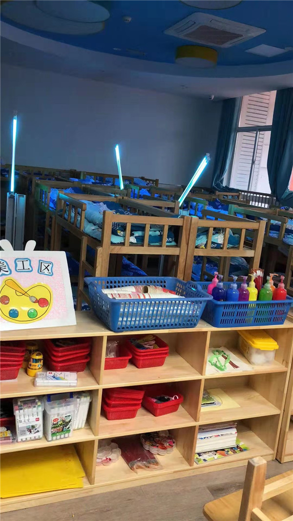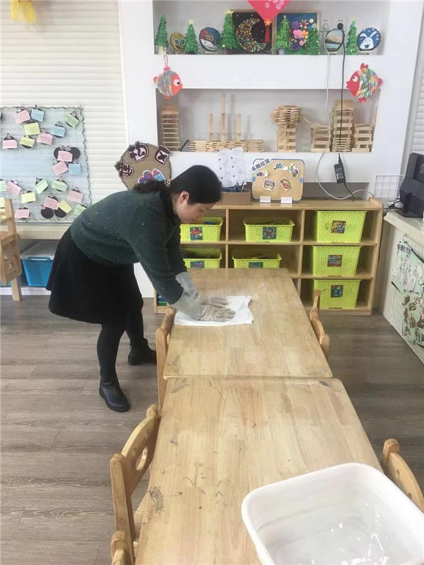 早晨来园第一时间将教室和走廊进行开窗通风,保持空气流通,晚上放学后运用紫外线灯消毒30分钟。一日活动各环节后,各班级保育教师用84消毒液按照3:200比例兑水擦拭桌椅以及门把手等幼儿易接触的地方,各个公共活动室的犄角旮旯也没有放过。幼儿接触过嘴巴的口杯、餐具均送到幼儿园的消毒柜进行消毒,毛巾则进行暴晒。
