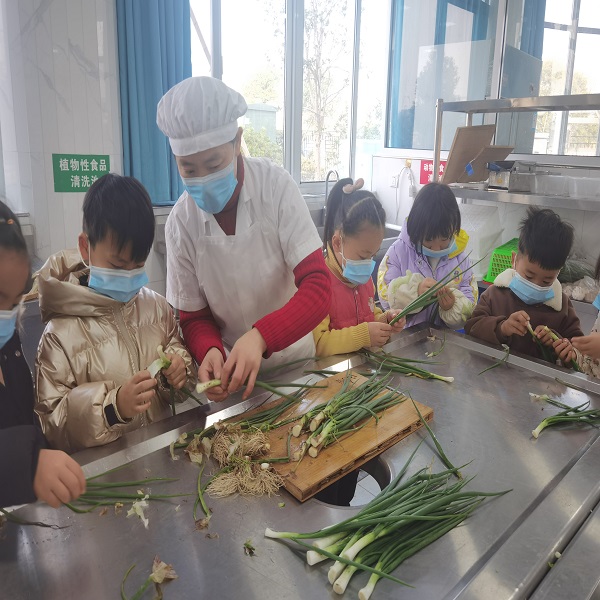 参观了食堂后厨各功能室之后,幼儿了解了从原料择洗、烹饪、消毒、存放、留样到台账登记等各个环节的具体操作程序,幼儿非常感兴趣并主动帮助食堂阿姨摘菜。