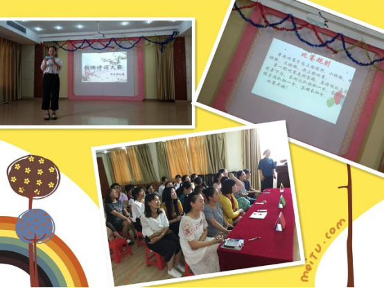 为促进青年教师的专业成长,提高教学基本功,9月8日 下午 ,新生幼儿园举行了“咏诵中华诗词 弘扬传统文化”青年教师诗词大赛。
