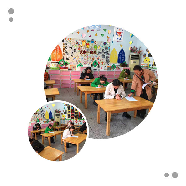 最后一项,理论考试,为保证公平公正,采取的单桌单人、闭卷开考的形式。各班保育老师都很重视这次的活动,事先做好的充足的准备,个个聚精会神地审题、答题,都在规定时间交上了一份份令人满意的答卷。