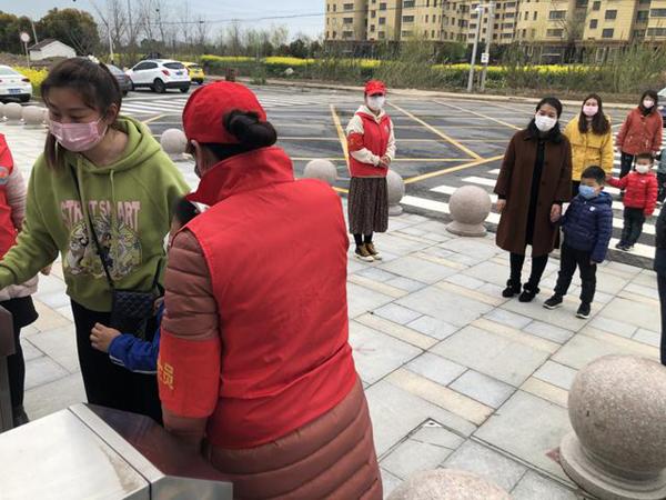 幼儿晨检,保健老师在大门口进行幼儿入园晨检,幼儿在幼儿园门前排队,并且保持一米以上的距离。无异常的幼儿自己进班(家长不进园)。
