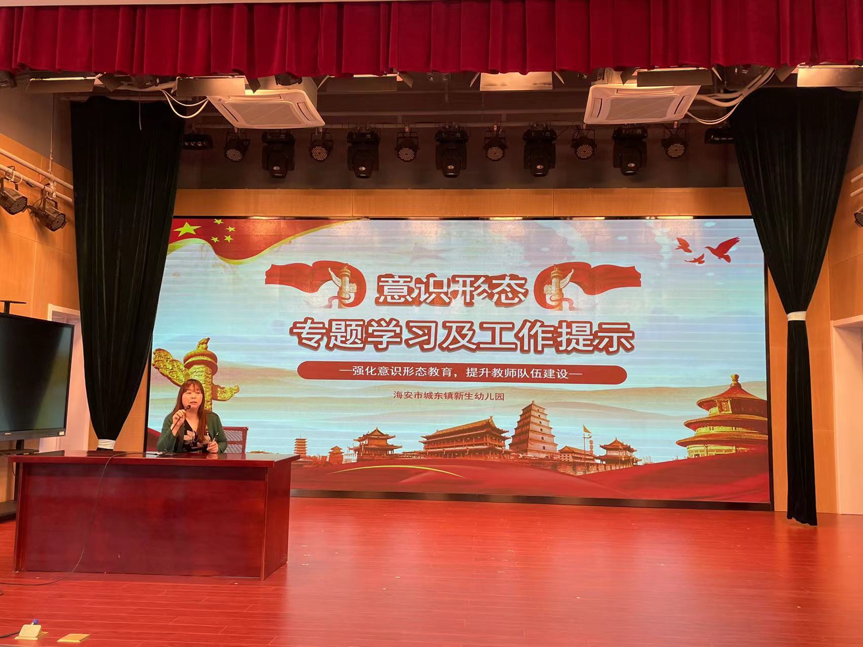 为了深入学习贯彻落实习近平总书记关于意识形态工作系列重要讲话精神,提高提升意识形态工作组织力,筑牢意识形态防线。2022年5月23日,海安市城东镇新生幼儿园开展意识形态专题学习教育活动。