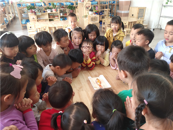 晨间谈话时大家的焦点都停留在早已僵硬、干燥的红燕鱼身上,“红燕鱼死了,我好难过哦”“老师,我们以后再也看不见红燕鱼了” “老师,鱼死了也会上天堂吗”“会的,我们为它祈祷吧”于是孩子们自发合起双手为红燕鱼祈祷,愿它在天堂里能一直快乐的生活……