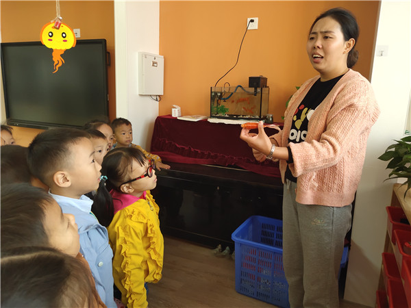 11月1日早上晨间接待时,新生幼儿园中二班的于老师突然发出“啊——”的一声惊叹,班级一直养在鱼缸里的那条最大的红燕鱼僵硬地躺在了地上,随着这一声惊叹,已经到班的孩子们都围过来:“它死了”“啊?它怎么会死的呢?”“一定是它跳水的”“小鱼不能离开水”“是的,夜里我们都回家了,它跳出来,没人能救得到”大家你一言我一语,纷纷议论着……
