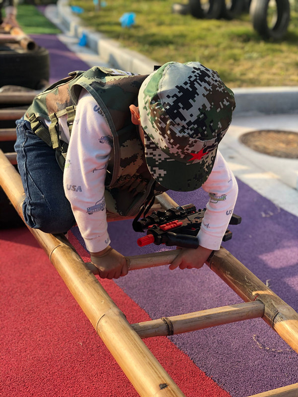 随着一声:“冲啊”,野战营里的“战斗”正式打响了。孩子们精神抖擞,有的挥舞旗子在指挥,有的“匍匐前进”,有的手持冲锋枪,有的趴在轮胎塔上侦查,有的越过竹梯,个个勇往直前。孩子们在自由的环境里,感受着合作的快乐,幼儿也在玩的过程中不知不觉学会了“钻、爬、跳、跨等技能”,真正的在玩中发展了幼儿的身体技能。