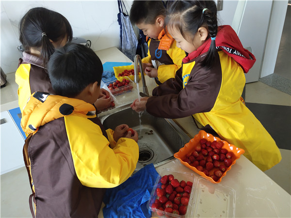 在体验馆,孩子们先认识了各种各样的食材,随后,在老师的协助下,大家开始动手洗水果、剥皮、切水果。