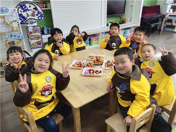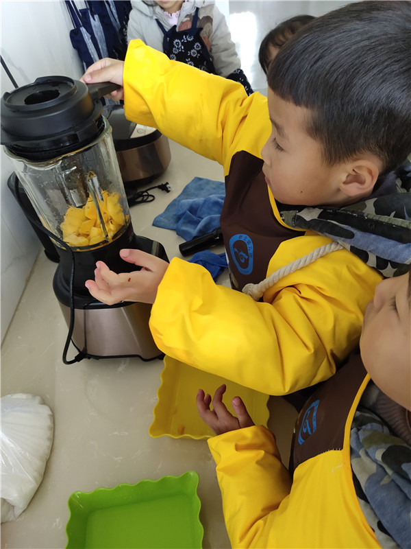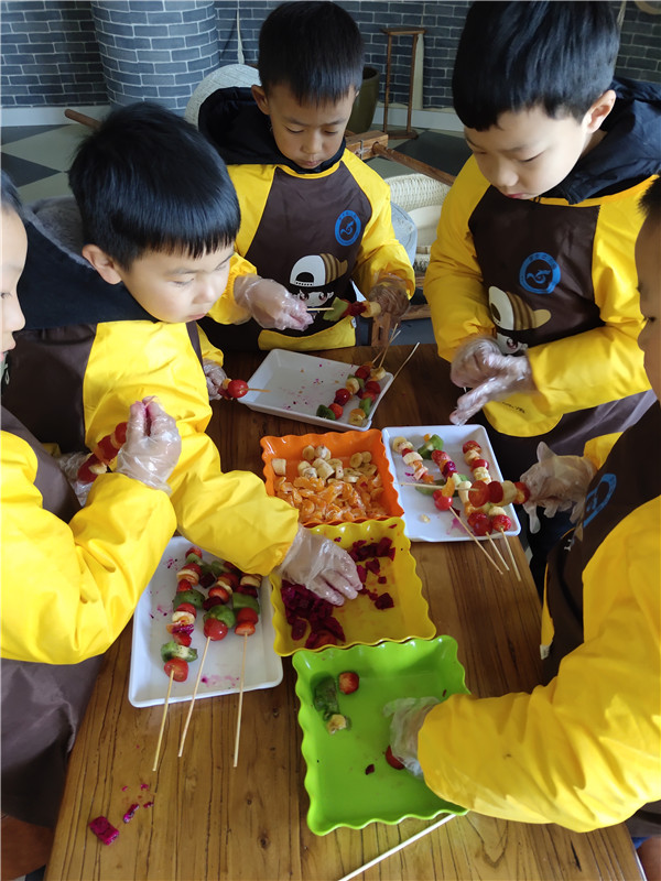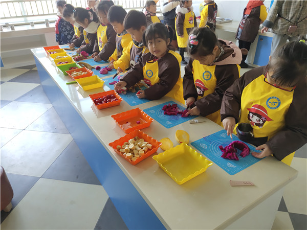 “我是草莓桔子串儿”“我做的芒果凤梨串儿”“哇!真漂亮啊!”“我包的糖果肠可漂亮了”“我来榨火龙果”“我榨草莓汁”“啊——有点酸呢!” ……体验馆里不断传出孩子们欢快的笑声、惊叹声,热闹非凡。