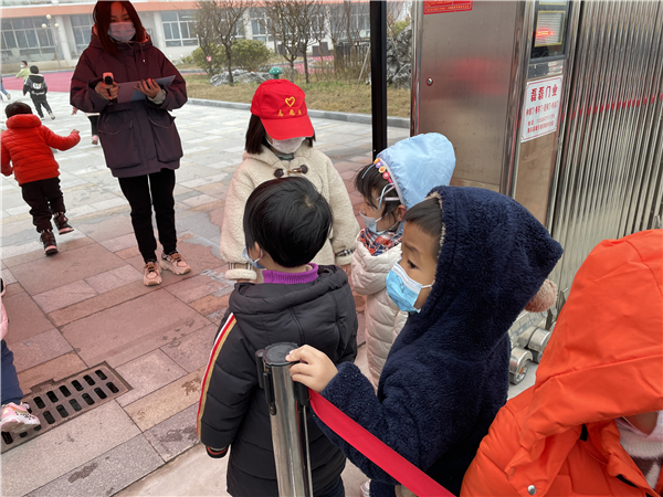 早上导护时,大班的小小志愿者也可以帮小班中班的弟弟妹妹排队,“请排好队!”、“带好口罩哦!”小小志愿者一声声清脆的声音提醒着大家,督促小朋友们有序排队测温。