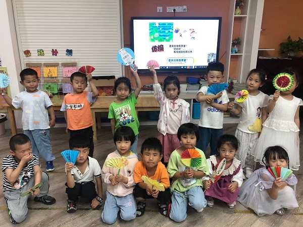 第四个环节就是小朋友们最喜欢的趣味手工了,今天做的手工是纸折扇。老师先给大家看了几个不同款式的手工扇,有憨态可掬的小猪扇、有威风凛凛的小狮子扇、有花朵扇、还有可以折叠和收缩的神奇纸扇。孩子们被这些纸折扇吸引了,拿到材料包后都迫不及待地动起手来。在老师的指导和帮助下,每个孩子都做出了属于自己的小猪和小狮子扇子。还有的孩子意犹未尽地向老师学习可以收缩的神奇纸扇做法。