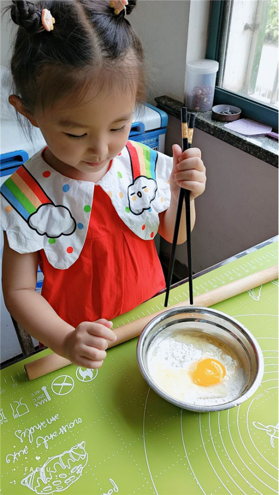 说干就干!爸爸帮我准备好面粉、鸡蛋、水,我用盒子舀了满满一盒面粉,倒入铁盆中,再加入鸡蛋和水,用筷子快速地搅拌均匀。接着,把搅拌好的面倒在菜板上,撒上面粉,用手不停地揉搓。一开始,面有一点粘手。我往面上撒了一点面粉,用手继续揉。谁知道,面粉又好像不听话的娃娃,不愿意粘在面团上,没办法,爸爸开始帮我揉面,终于把它们连在了一起。面团和好后,我把它装进了塑料袋,让面团“睡”一会儿。
