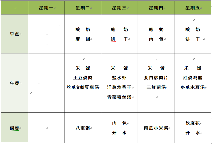 2020年上半年第八周幼儿食谱