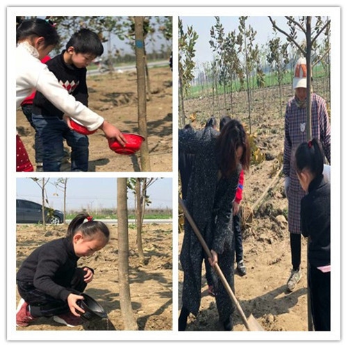 在课程游戏化理念的引领下,新生幼儿园充分利用周边资源,在3月12日植树节这天,组织孩子们开展了“我为大地添新绿”的社会实践活动。孩子们唱着园歌,拎起小水桶,背起小铁锹,来到种植区,师幼合作植树。孩子们把小树放进挖好的坑里、有的拿起小水桶给小树浇水、有的为小树松土,他们用充满爱心的行动和童稚的语言表达了对树木的爱护和祝福,形成了植绿护绿的环保意识,体验了劳动的乐趣,人人争当“绿色小天使”。